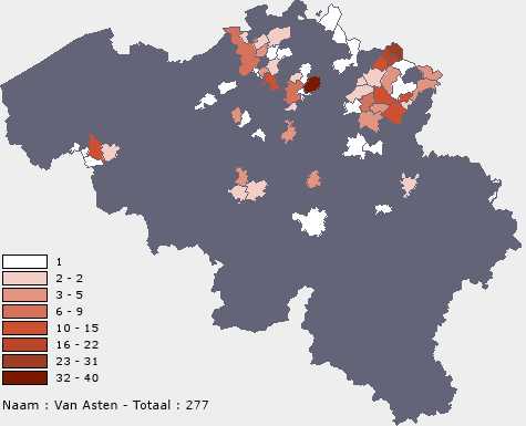In Belgiλ wonen (data uit 1996) ook een aanzienlijk aantal van Asten's (zie kaart), waarnaar nog verder onderzoek gedaan moet worden.