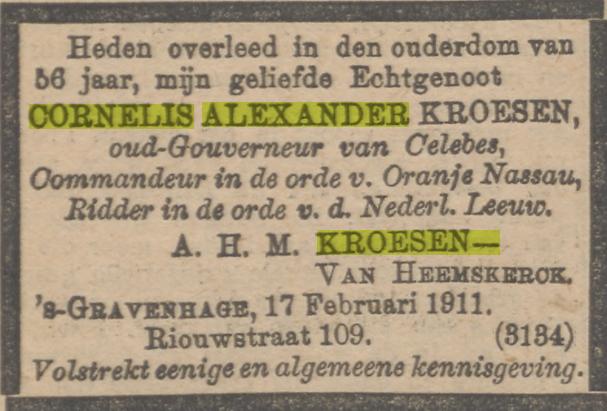 Johannes Abraham Bronkhorst (Man) † Ambarawa 25-08-1910 (RANI 1911/95); de almanak geeft 1909 als sterfjaar; dit moet ongetwijfeld 1910 zijn.
