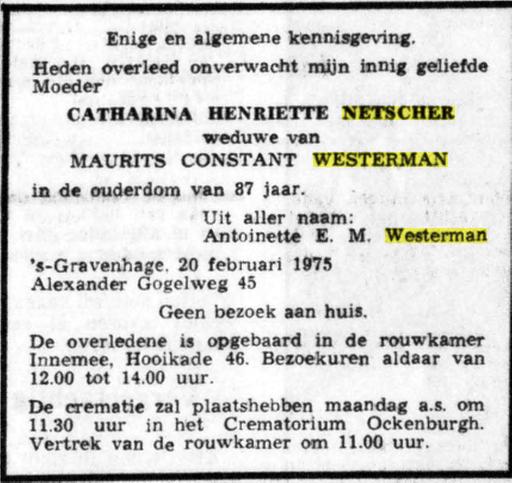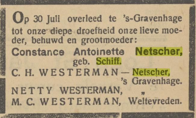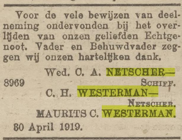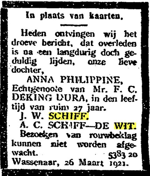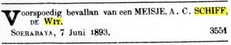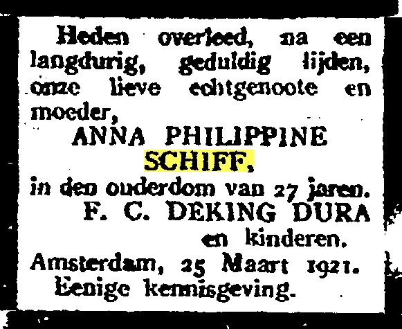 Johanna Schr, dr. van Johan Schr en Johanna Bronkhorst, * Amsterdam ca. 1855 † Padang 05-07-1936 (LDS Filmnr. 1474372 akte 20)