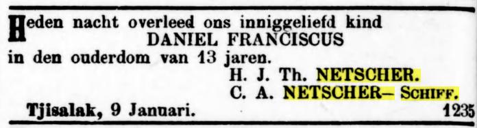 x Banda 28-11-1861 (RANI 1863 p.20) Johanna Margaretha Charlotta LANTZIUS, dr. van Maurits Lantzius * Banda 1808 † Banda 09-07-1877, Perkenier te Banda x Banda-Neira 01-06-1831, Banda-Neira Johanna Isabella Hoeke * Banda-Neira 13-10-1817 † Banda-Neira 26-07-1870
