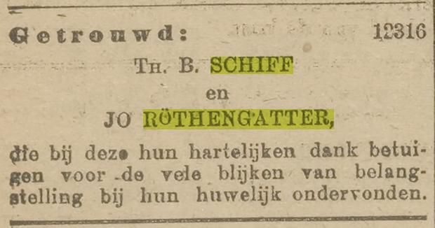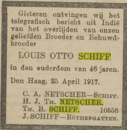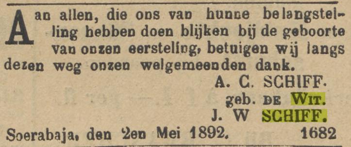 BRP14 p.107 Theodora Elisabeth geb. 27 april 1855 (aangifte 27 april 1855); ouders: Daniel Hendrik Willem Schiff, oud 30 jr., geëmployeerde bij de factorij der Nederlandsche Handel- Maatschappij te Pekalongan, en zijn echtg. Henriette Ottoliene van Bronckhorst, oud 18 jr., beiden wonende te Pekalongan; aangever: de vader; getuigen: Cornelis Sickesz, oud 55 jr., Ridder der Militaire Willemsorde 4e kl., gepensioneerd majoor der infanterie, en Adriaan Jacobus Johannes Hansen, oud 34 jr., pakhuismeester, beiden wonende te Pekalongan. [RA 1856, 486: Theodora Elisabeth Schiff, geb. 27 april 1855]