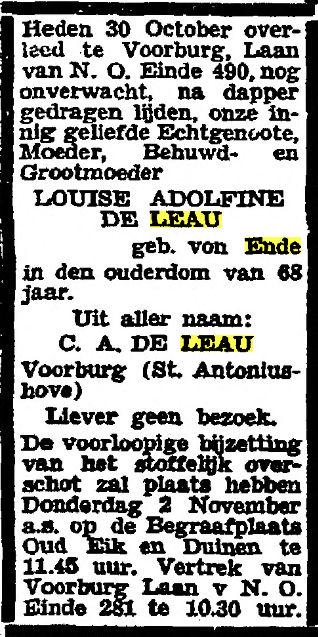 Het nieuws van den dag voor Nederlandsch-Indië 25-01-1930 Familiebericht: heden 25-01-1930 overleden in den ouderdom van 84 jaren Mw. J. de Leau-Flikkenschild. Gang Holle 48.