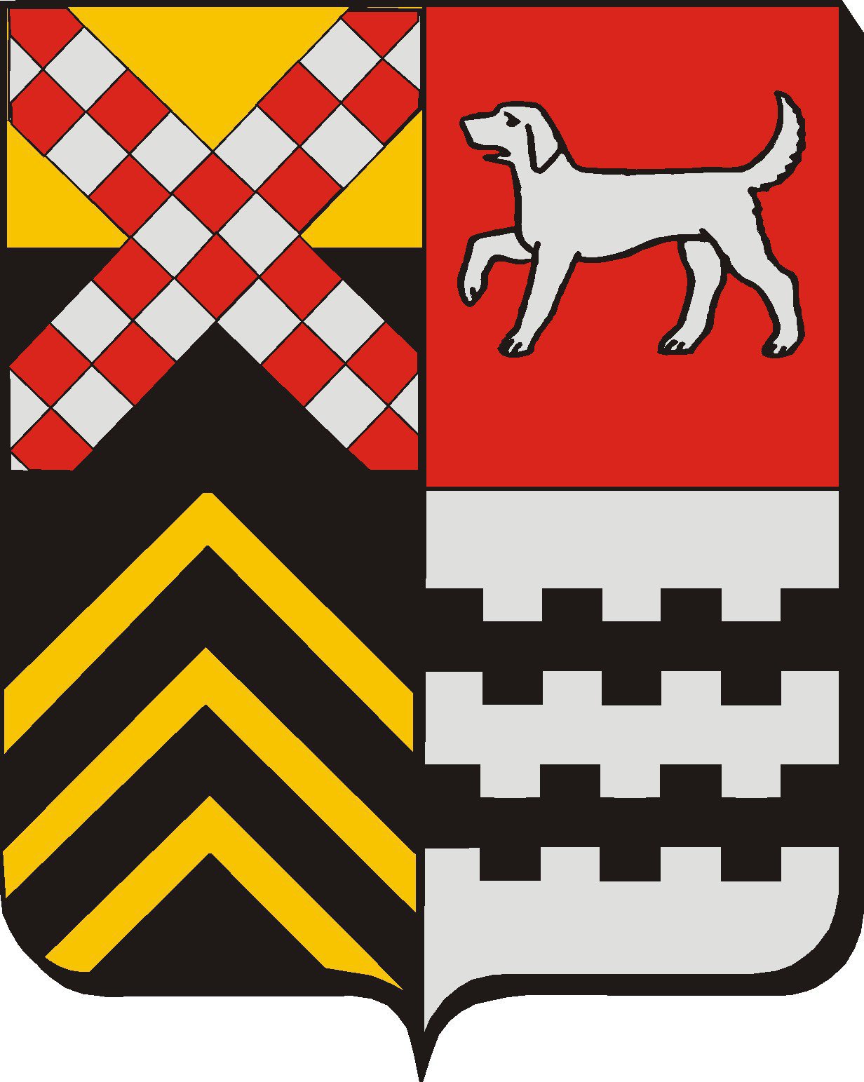 Wapen: gevierendeeld:I gedeeld van goud en zwart en over alles heen een schuinkruis, geschaakt van rood en zilver; II in rood een gaande zilveren brak; III in zwart drie gouden kepers; IV in zilver twee beurtelings gekanteelde zwarte dwarsbalken.