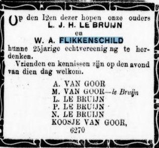Soerabaijasch handelsblad 05-11-1908 op den 12en dezer hopen onze ouders LJH le Bruijn en WA Flikkenschild hunne 25jarige echtvereeniging te herdenken.