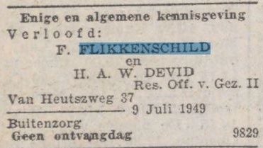 Het dagblad: uitgave van de Nederlandsche Dagbladpers te Batavia 09-07-1949 verloofd: F. Flikkenschild. en H.A.W. Devid, Res. Off. v. Gez. II, van Heutszweg 37 / Buitenzorg 9 juli 1949