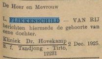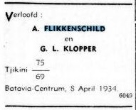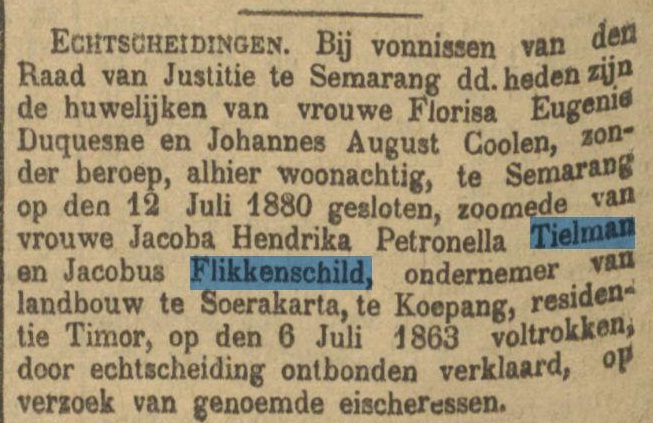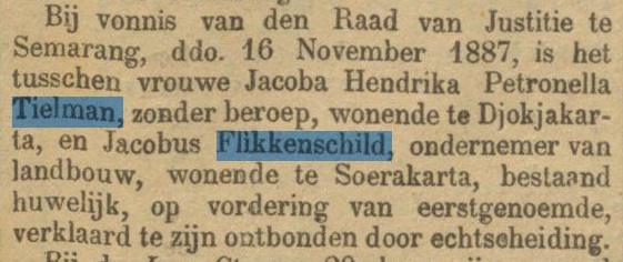 De geboorte inschrijving van Jacoba FLIKKENSCHILD 1855-1930 is opmerkelijk: haar geboorte te Soerakarta op 19-07-1855 werd pas in de Naamlijst van de Regeringsalmanak van Ned. Indië van 1873 (het jaar van haar huwelijk) gemeld.