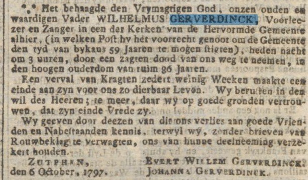 | Het behaagde den Vrijmagtigen God, onzen ouden en waardigen Vader Wilhelmus Gerverdinck, Voorlezer en Zanger van een der Kerken van de Hervormde Gemeente alhier, in welken post hij het voorrecht genoot om de Gemeente den tijd van bijkans 59 jaren te mogen stigten, heden nacht om 3 uuren, door een zagten dood van ons wegteneemen, in den hogen ouderdom van ruim 86 jaaren. Ean verval van kragten zedert weinig weeken maakte een einde aan zijn voor ons zo dierbaar leven. Wij berusten in den wil des Heeren, te meer, daar wij op goede gronden vertrouwen, dat Zijn einde Vrede zij. Wij geeven bij deezen van dit ons verlies aan goede Vrienden en Naabestaanden kennis, terwijl wij zonder brieven van Rouwbeklag te verwagten, ons van hunne deelneeming verzekert houden.