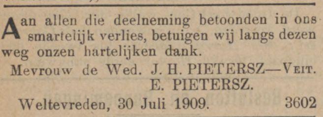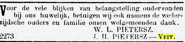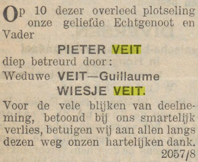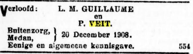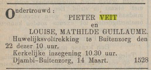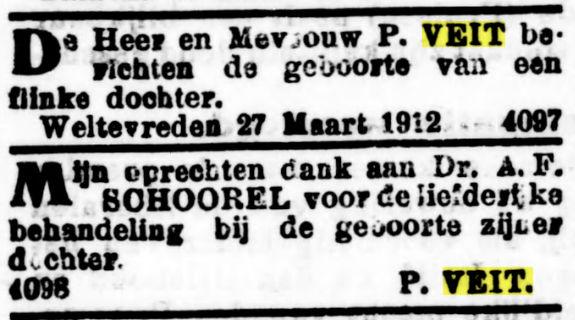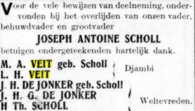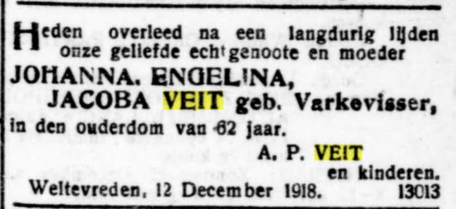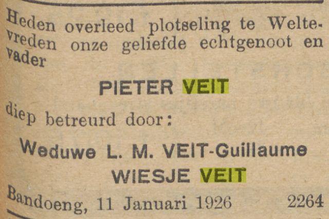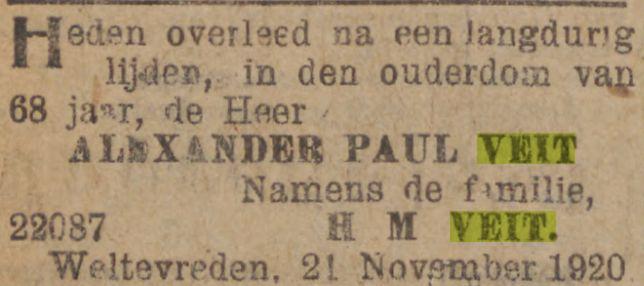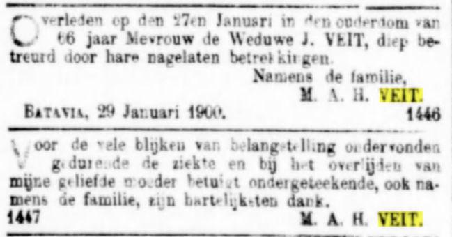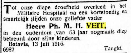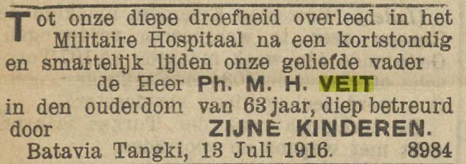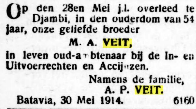 Op den 28en Mei overleed te Djambi, in den ouderdom van 54 jaar, onze geliefde broeder M.A. Veit, in leven oud-ambtenaar bij de In- en Uitvoerrechten en Accijnzen. Namens de familie A.P. Veit. Batavia, 30 Mei 1914