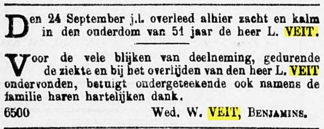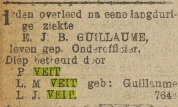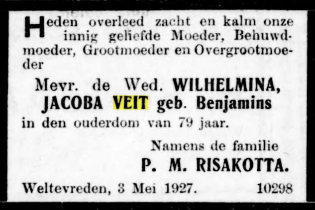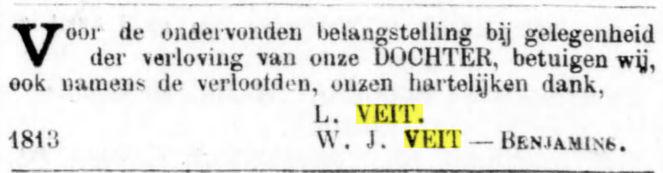 Daarnaast een groot fragment in de genealogie van RIEMSDIJK - TAK VEIT. p.327, betreffende 11 kinderen van Louis Veit en Wilhelmina Jacoba Benjamins; deze is in mannelijke lijn uitgestorven met alleen een dochter van Piet Veit en Louise Mathilde Guillaume.