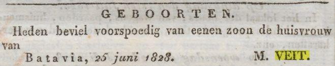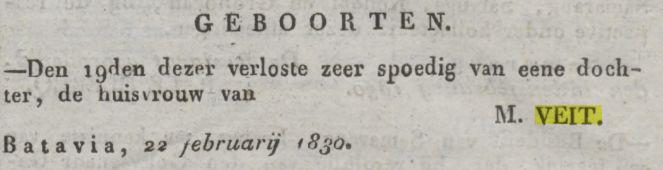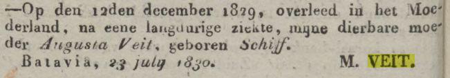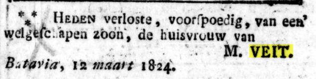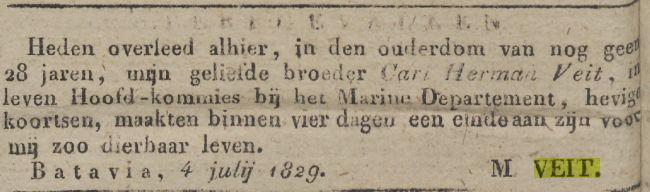 † Batavia 04-07-1829 (RANI 1830 p.194); Heden overleed alhier, in den ouderdom van nog geen 28 jaren, mijn geliefde broeder Carl Herman Veit, in leven Hoofd-kommies bij het Marine Departement, hevige koortsen, maakten binnen vier dagen een einde aan zijn voor mij zoo dierbaar leven, Batavia 4 juli 1829. M. Veit.