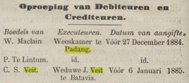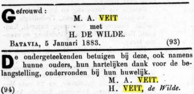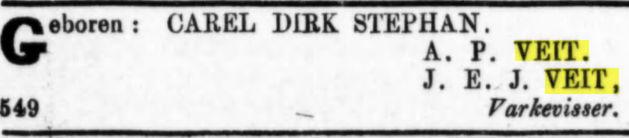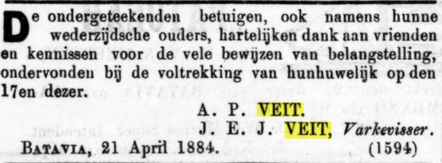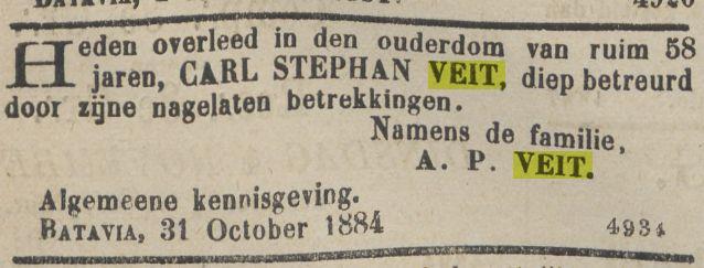 Dit impliceert dat alle verdere Veit's afstammen van Carel Stephan (Carl Stephan) Veit * ca. 1826 † Batavia 31-10-1884 en zijn Chineesche vrouw Tan Loan Nio.