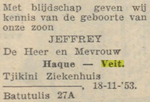 Geboorte van Jeffrey. Hr. en Mw. Haque-Veit, Tjikini Ziekenhuis / Batutulis 27A, 28-11-'53