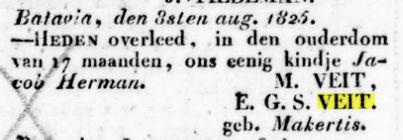 † Batavia 09-08-1825 J.H. Veit (Kind) (RANI 1826 p.184)