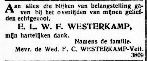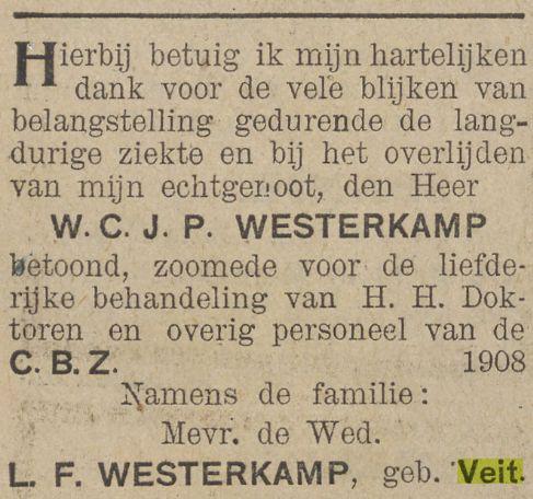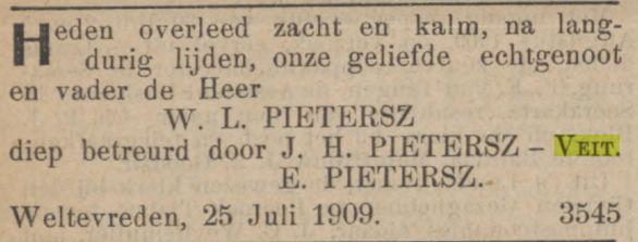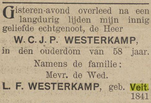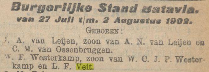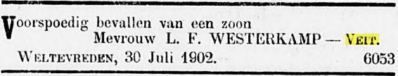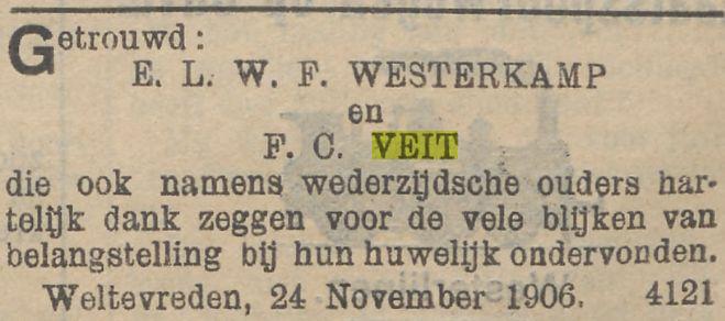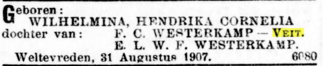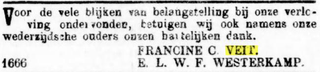 VIter. FRANCINA CORNELIA VEIT, geb. Batavia 30 Nov. 1881. Als weduwe verkreeg zij 11 Juli 1917 het recht op het graf Tanahabang Weltevreden afd. I no. 90. Zij huwde Batavia 24 Nov. 1906 EMILE LEOPOLD WILLEM FREDERIK WESTERKAMP, geb. Batavia 21 Maart 1879, overl. Batavia 13 April 1917, begr. in evengenoemd graf, adj. boekh. Gouv. Telef., daarna employé Palm en Van Amstel te Batavia, zn. van WILHELMUS JACOBUS W. en MARIA HENDRIKA CORNELIA PIEPLENBOSCH.