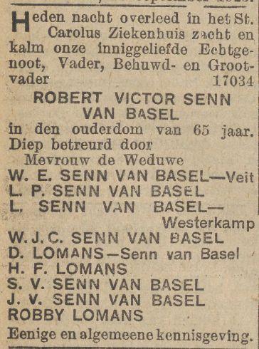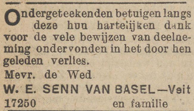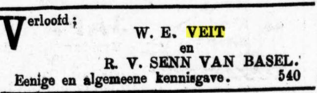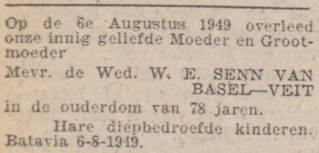 VI. WILHELMINA ELISABETH VEIT, geb. Batavia 30 Jan. 1871, huwde te Batavia 10 April 1895 ROBERT VICTOR SENN VAN BASEL, geb. Buitenzorg 28 Dec. 1857, ged. Batavia 22 Juli 1866, overl. Weltevreden in het St. Carolus Ziekenhuis 25 Sept. 1923, klerk bij den Geneeskundigen Dienst, daarna controleursklerk te Bindjei, laatstelijk gep. ambtr., zoon van PIETER S. v. B. en SUSANNA JACOBA ANTOINETTE BENJAMINS.