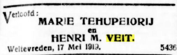 Verloofd Marie Tehupeiory en Henri M. Veit. Weltevreden 17 Mei 1919.