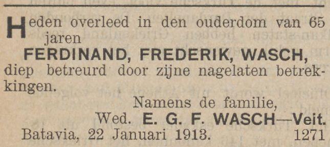 x (2) Batavia 19-03-1873 (RANI 1874 p.184) Ferdinand Frederik WASCH, zn. van Franciscus Fredericus Wasch 1815-1860 en de inlandse vrouw Tepe.