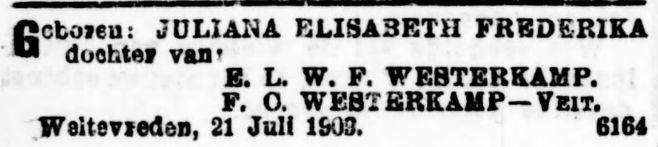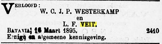 VIbis. LOUISE FRANCINA VEIT, geb. Batavia 4 Sept. 1873, wonende te Soerabaia, huwde te Batavia 31 Juli 1895 WILHELMUS CORNELIS JOHAN PIETER WESTERKAMP, geb. Batavia 1 Oct. 1867, overl. aldaar 8 Jan. 1925, begr. Tanahabang Welt. 9 Jan. 1925, afd. XXV no. 68; op het graf leest men: W. WESTERKAMP. Hij was handelsempl. en zoon van WILHELMUS JACOBUS W., ambtr. recherche, en MARIA HENDRIKA CORNELIA PIEPLENBOSCH.